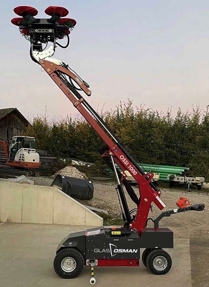"Ossi 1000" realisiert. Der Glasheber ist eine hochwertige mobile Verglasungs-Maschine mit Schwenkarm und integrierter Sauganlage. Das Glasmontagegerät verbessert die Produktivität und Sicherheit in der Konstruktion.